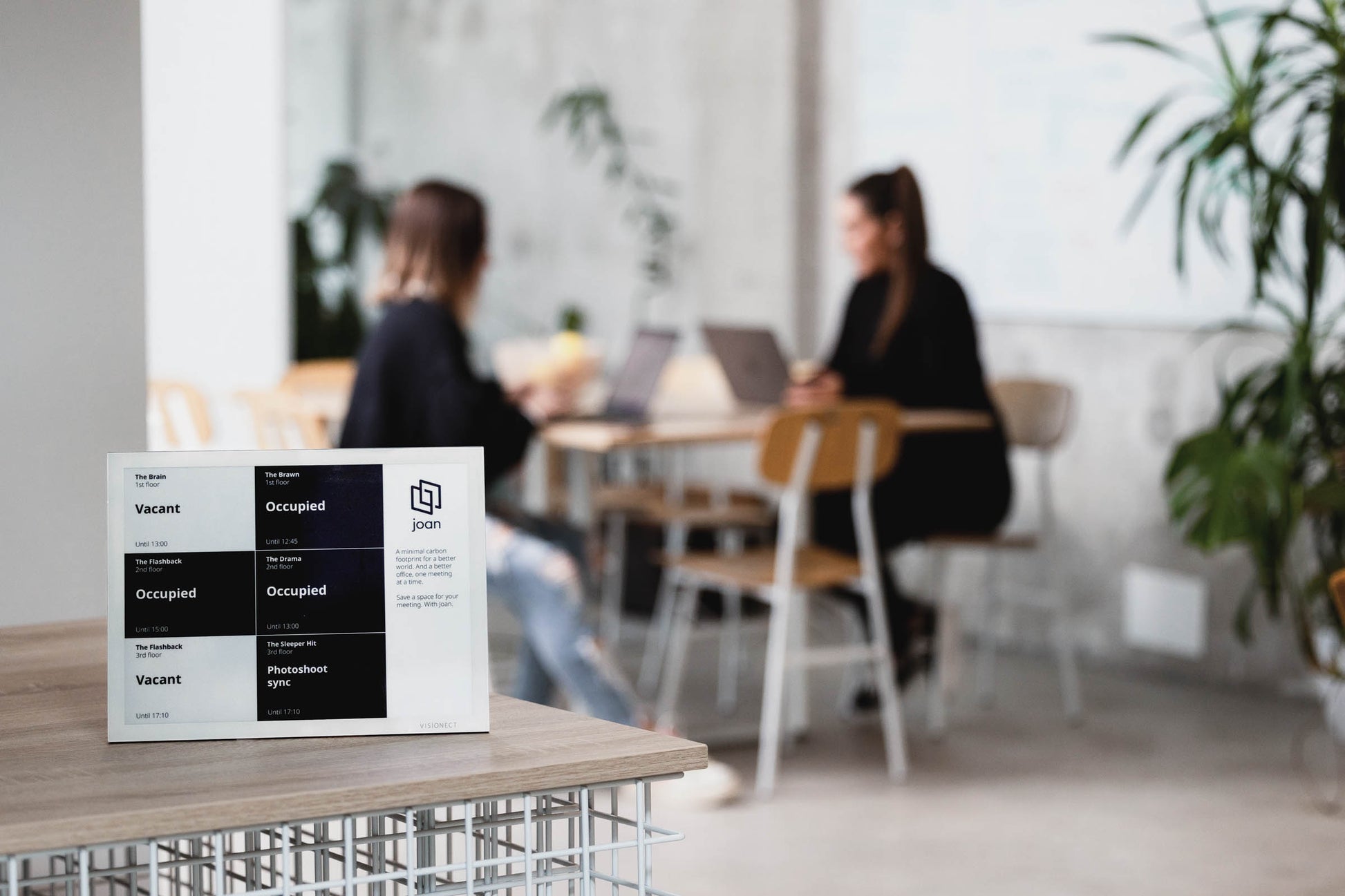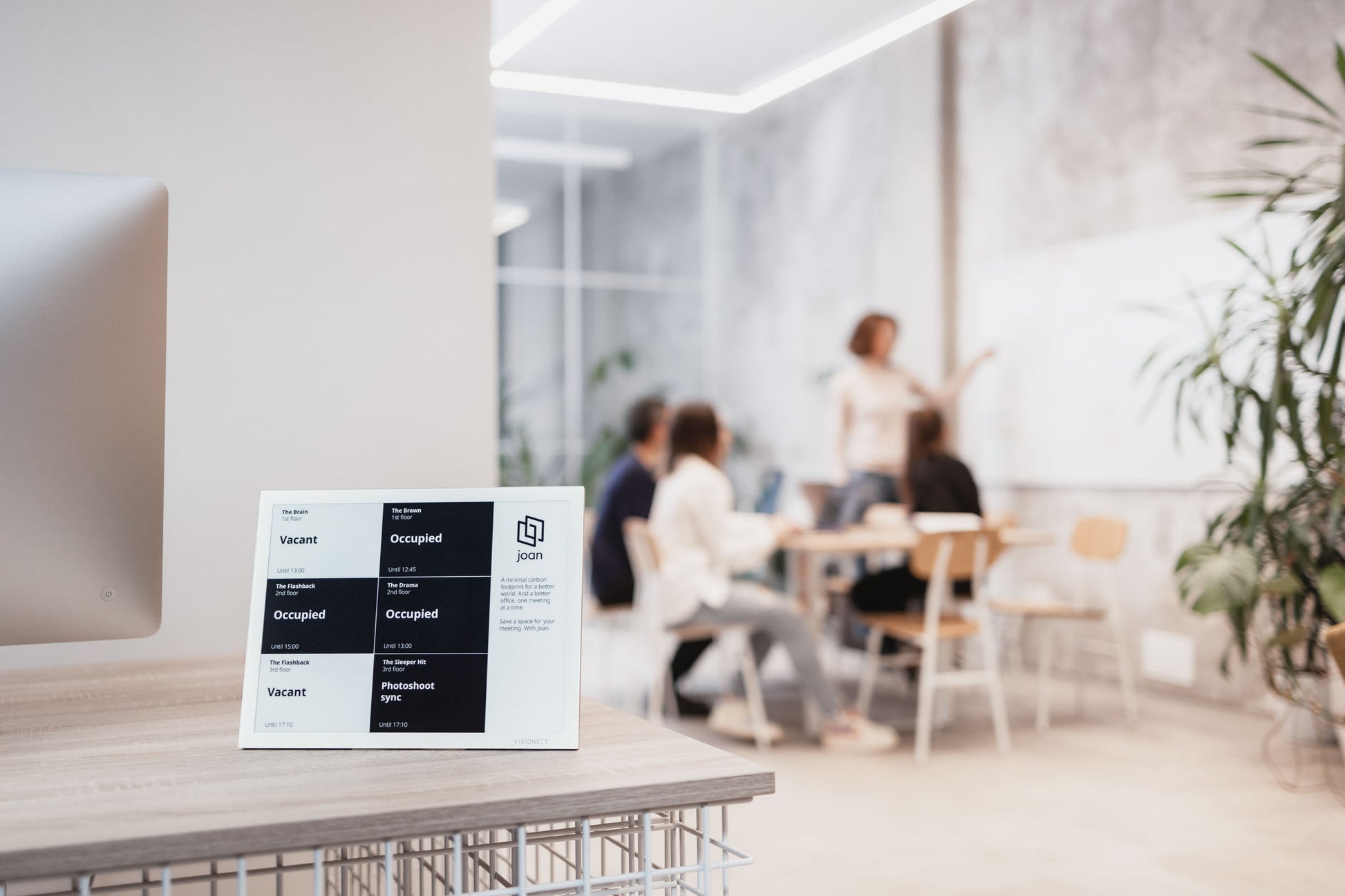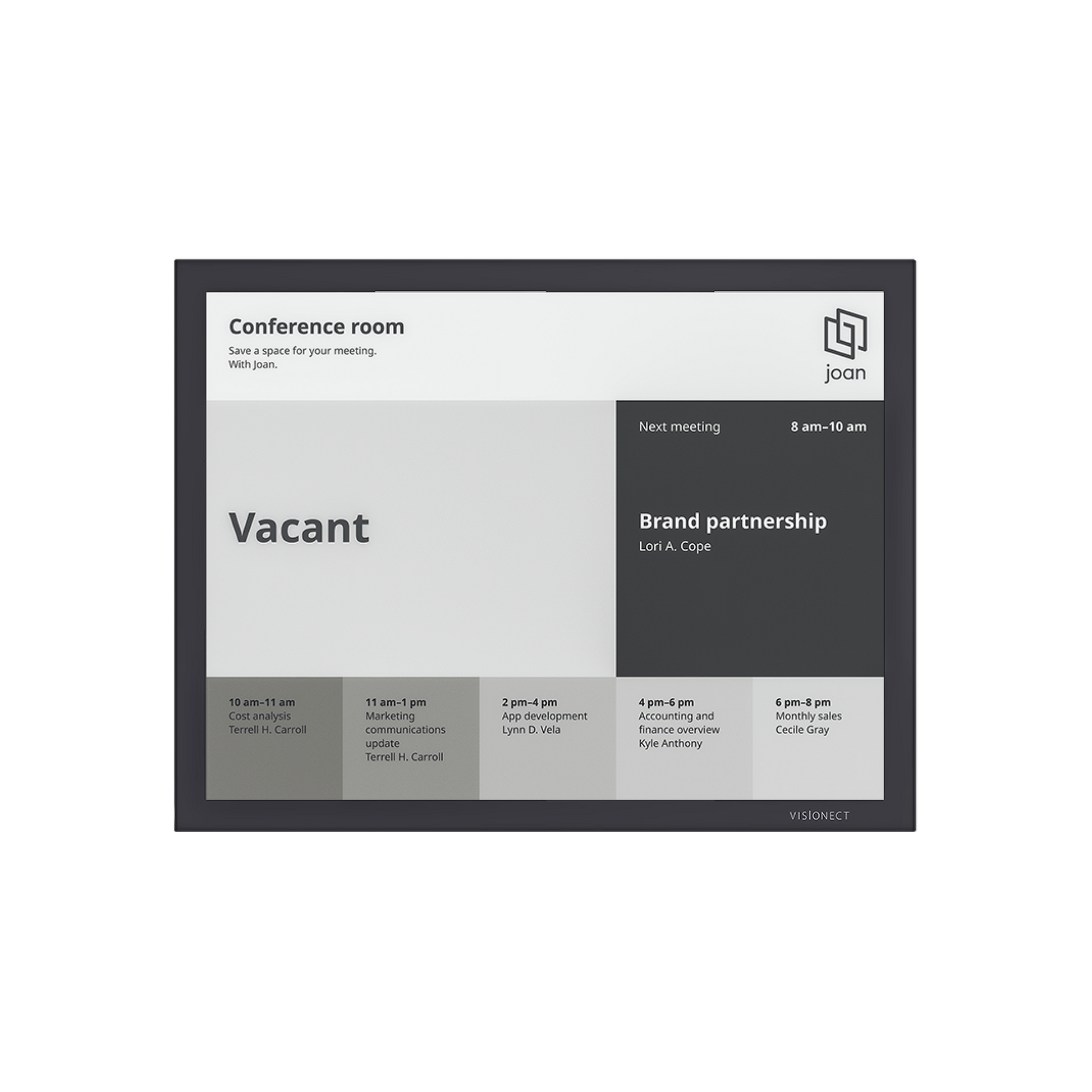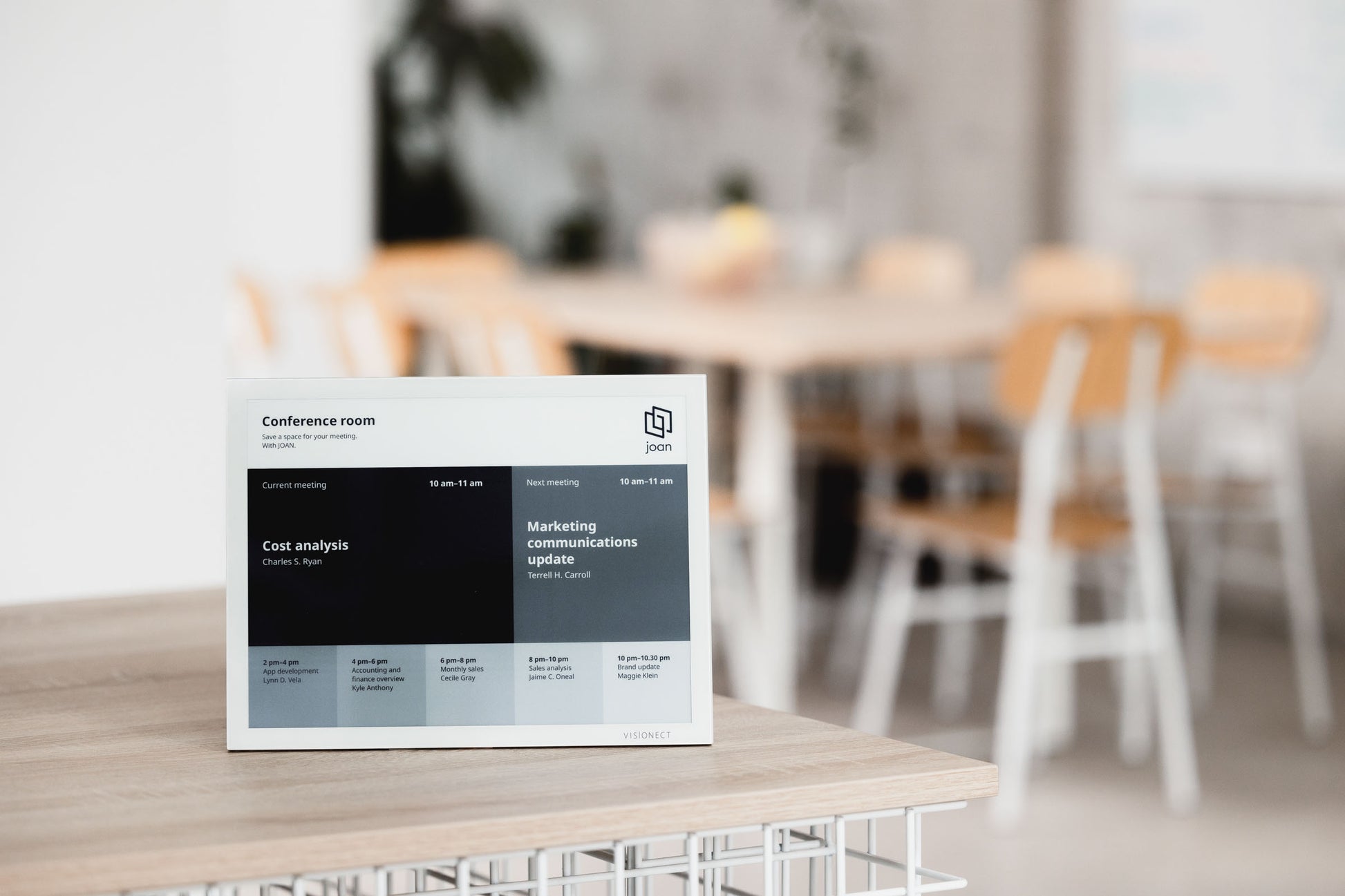 Never miss a meeting again! Joan 13 meeting room overview is the ultimate display, keeping you informed about up to 9 rooms with a single glance. This crystal-clear, non-touch display is ideal for busy offices.